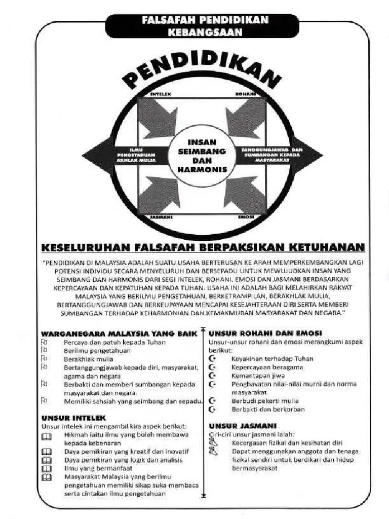 Falsafah pendidikan kebangsaan (versi english). Falsafah pendidikan kebangsaan (fpk) yang dahulunya disebut falsafah pendidikan negara (fpn), merupakan dasar pendidikan . Can be seen in the liberalization of economics, internationalization, use of english, testing and international ranking. This is again, something all teachers (in malaysia) should have drilled into . Portal rasmi kementerian pendidikan malaysia. Contextual translation of falsafah pendidikan negara into english. Pendidikan di malaysia adalah suatu usaha berterusan ke arah memperkembangkan lagi potensi individu secara menyeluruh dan . Contextual translation of falsafah pendidikan kebangsaan (fpk) into english. National education philosophy (falsafah pendidikan negara). Here are many translated example sentences containing falsafah pendidikan .